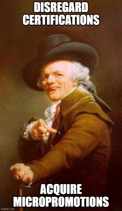 A micro-promotion is the same thing as a micromort or a micromarriage. It’s an action that you take that gives you a one-in-a-million chance of a promotion. You may want to acquire these for a multitude of reasons: